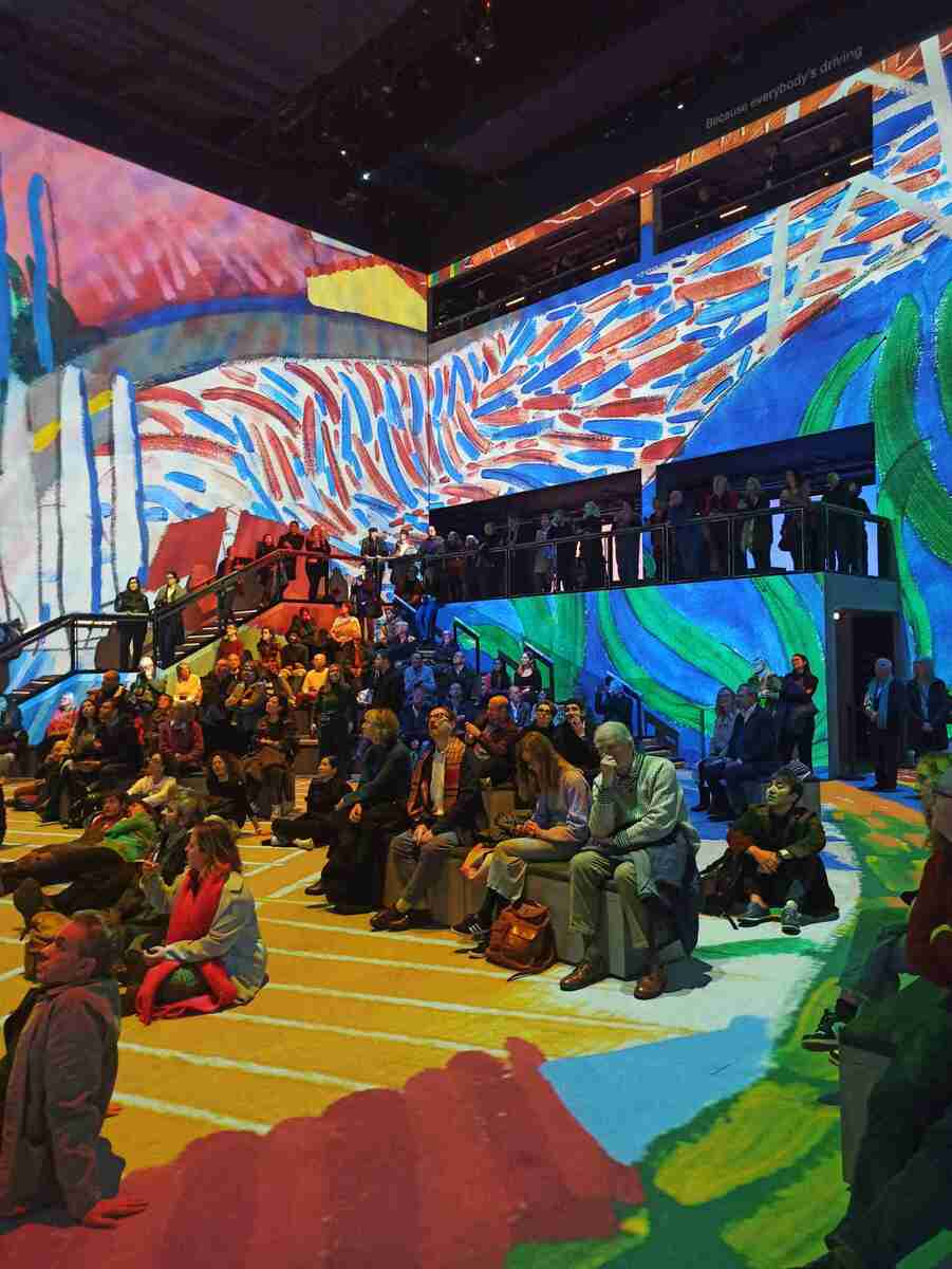 Playing out over a 50-minute loop, different works from across his career are brought to life in a variety of different ways. Some are almost disorienting, with bright imagery flashing at pace in every direction as the score undulates in tandem. Others are profound in their simplicity, for instance when Hockney’s voice is quietly giving context to slowly materialising static images of various pieces of work. The resulting experience is like seeing splashes of imagination take audio-visual form before your eyes and ears.