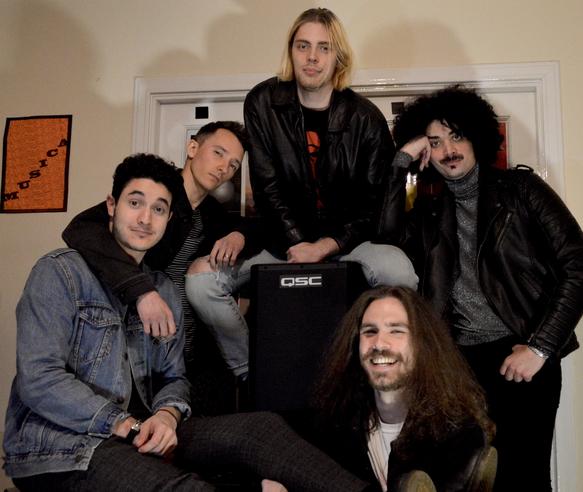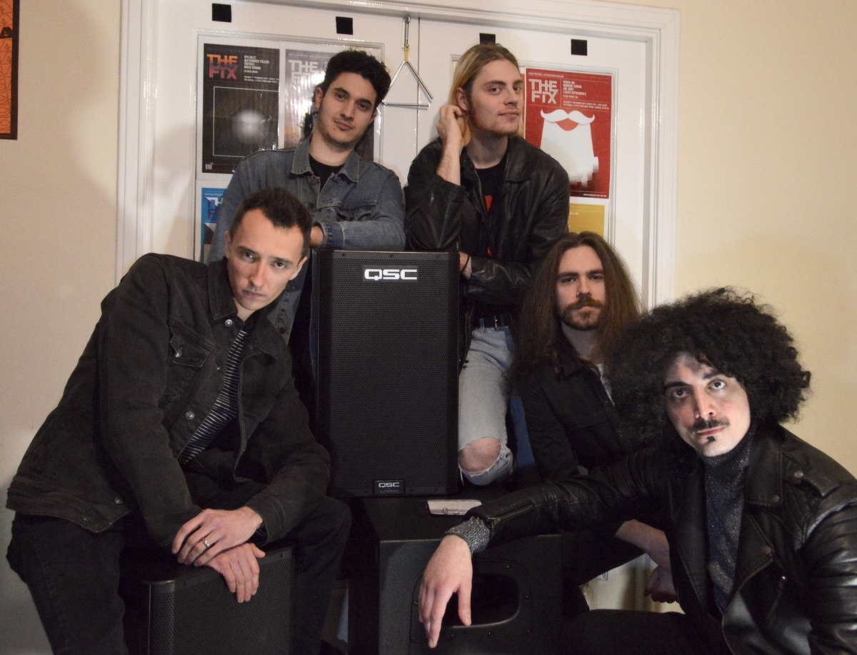For now, like everyone else, they find themselves mostly confined to the house, where four of the five band members live together in London. Making up Fuzz Skyler are British-Iranian lead singer and keys player, Fuzz, drummer Mark (who lives nearby with his wife), Portuguese and Greek guitarists Dan and Kostas, and Lithuanian bassist Arnie.