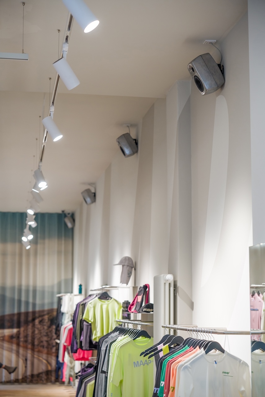 The MAAP Berlin LaB features an open layout filled with high-performance cycling apparel, which naturally absorbs sound. This allowed B.I.N.S.S to forgo additional acoustic treatments. Instead, they meticulously tuned the loudspeakers to the space, achieving balanced sound levels and eliminating dead zones or harsh hotspots.