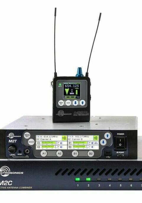 The Duet IEM system components include the M2Ra body pack receiver, the M2T/E01 dual-stereo half-rack transmitter, and the M2C-L wideband power combiner.