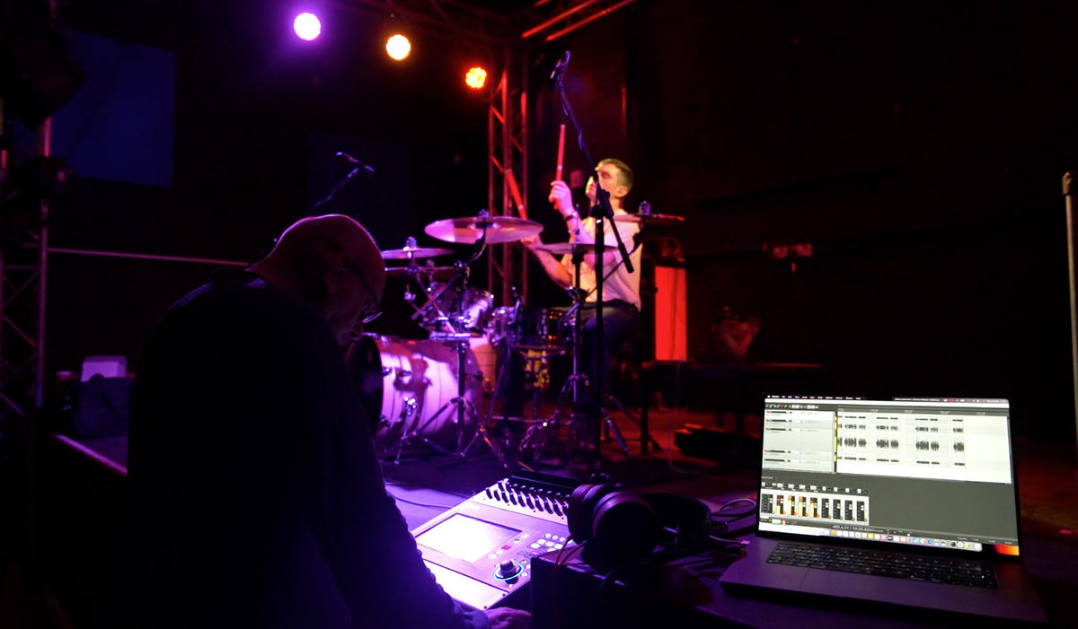 I ask Rolfe to play his kit, and ultimately at this point I’m just checking for clipping. Setting the channel gain through the TouchMix is very simple, and once I’m satisfied that it’s not going in too hot, and all looks fine on the MacBook, I hit record. Because I’m in a live venue, literally at the side of the stage, separation is minimal to say the least(!) but that’s no issue for this demo. I have headphones with me for reference which I will use after each take.