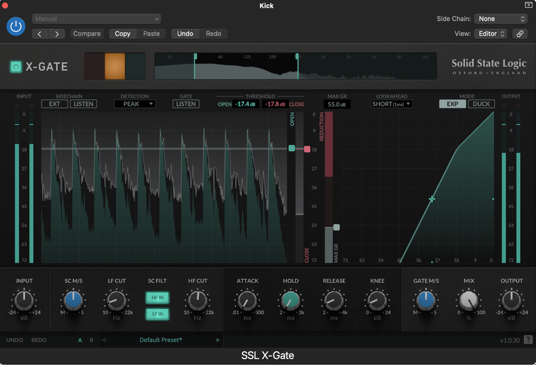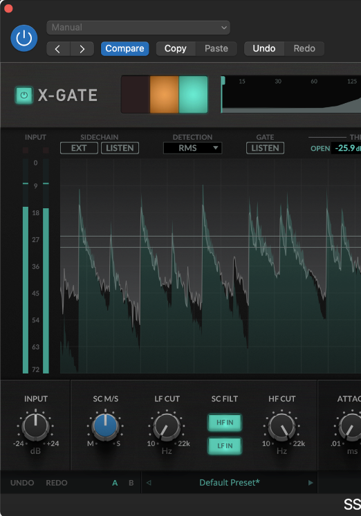 Being able to adjust settings on a graphical representation of the incoming audio makes it very simple to set your open and close thresholds. Another useful control is the ability to switch between PEAK/RMS for detection, especially if you use your gate for other instruments besides drums.