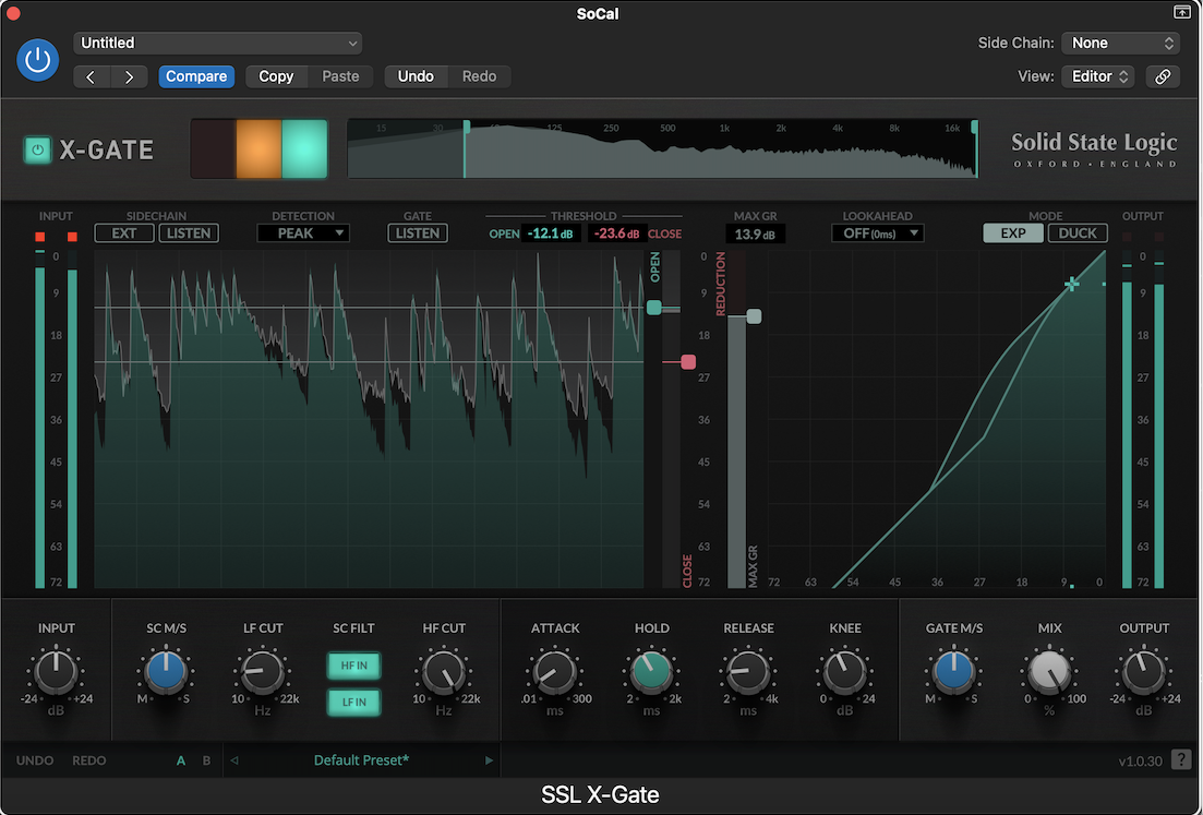 To the left and right of the central display – as is common with many SSL plugins – are the input and output meters aligned above their respective rotaries for accurate gain staging. Between these is a really comprehensive set of visuals starting with a rolling graphical waveform representation of incoming audio. A horizontal green line, representing the opening threshold, and red line representing the closing value coincidently mirror the value boxes above.