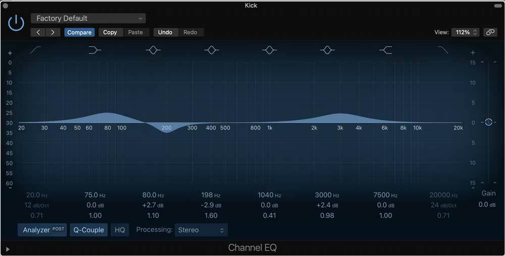 When EQ'ing the kick drum and bass, you want both elements to work together rather than competing for the same space. For example, if you try boosting the kick at 80Hz and find this adds the desired 'thud' required for your track, it often makes sense to cut the bass at this same frequency to allow the kick space to breathe. The same often applies vice versa to the bass.