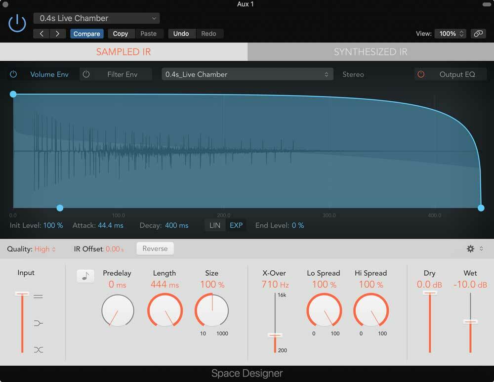 The more signal we send to a reverb channel, the 'wetter' it will sound. If we pull down the fader on a track, but send a strong signal to the Aux reverb channel, it gives the impression of an instrument sounding further away.